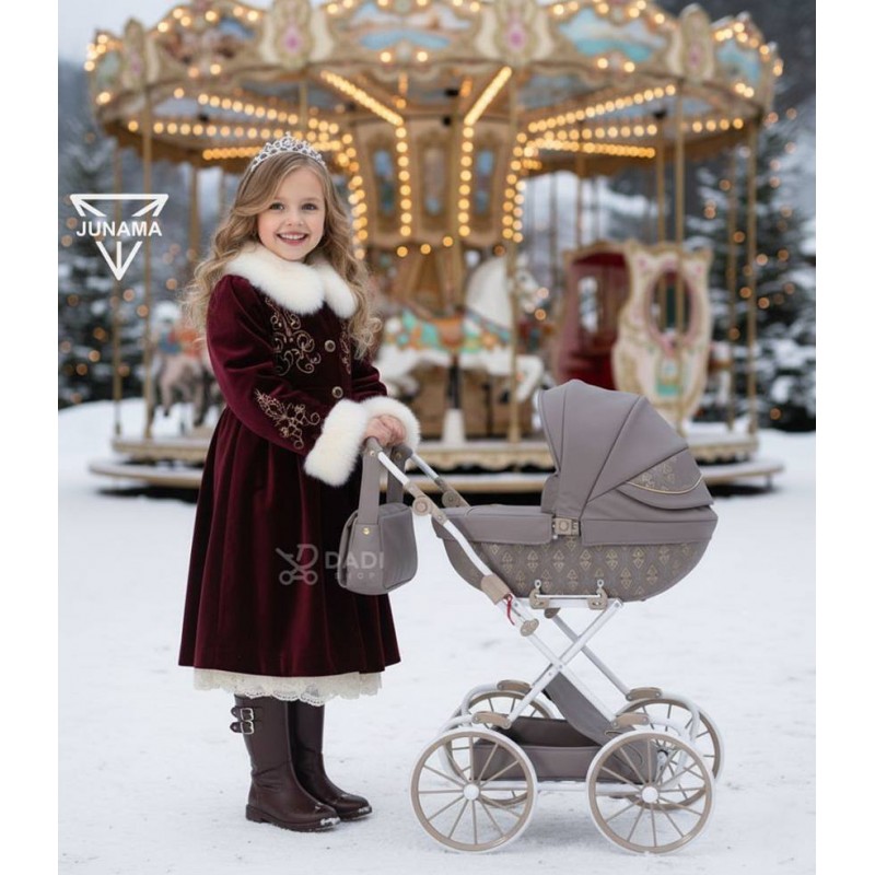 Magiczny zimowy spacer z ukochaną lalką – elegancki wózek Junama Art Deco Mini otula ciepłem i stylem każdą zabawę na świeżym powietrzu.