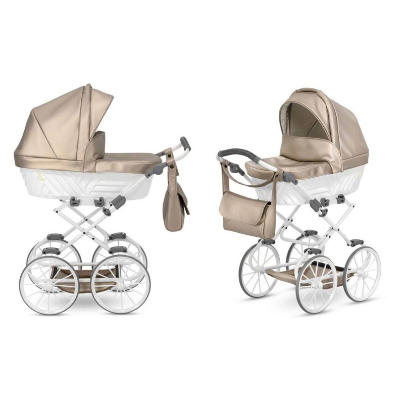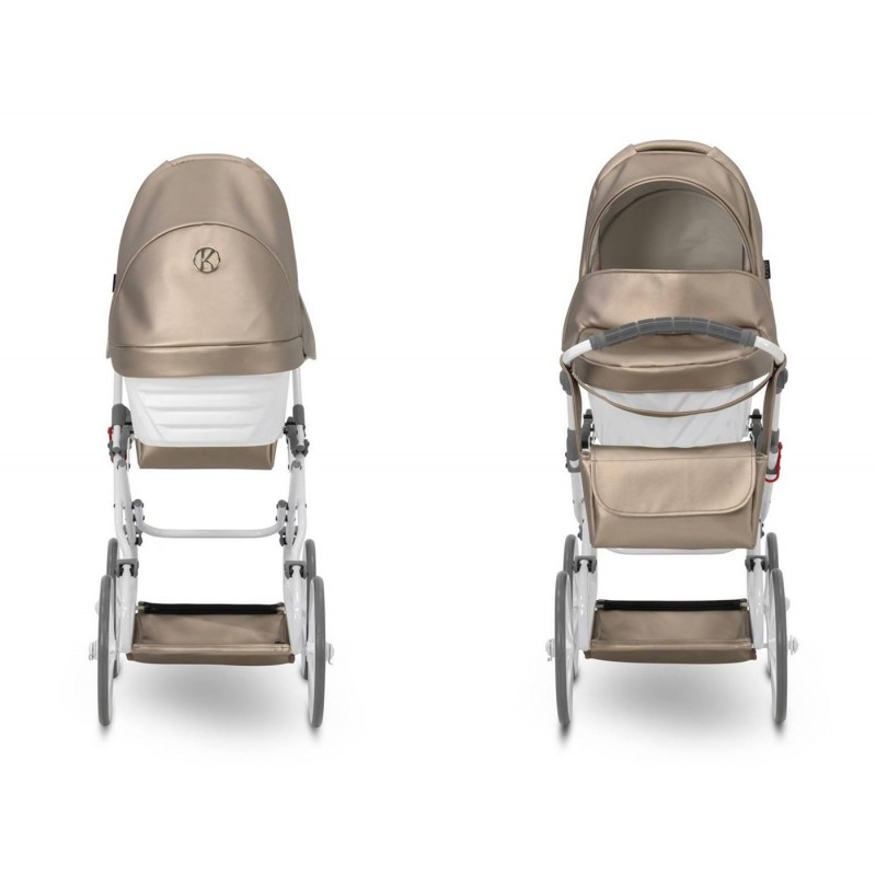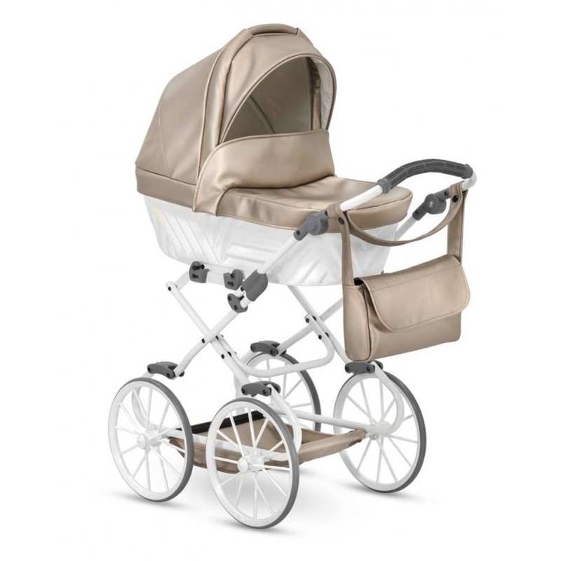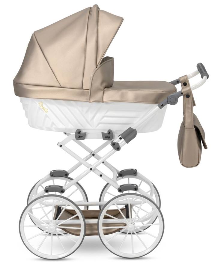 Ciepły odcień beżowego cappuccino z delikatnym metalicznym połyskiem i białym dołem gondoli sprawia, że ten model wygląda jak miniatura prawdziwego, luksusowego wózka. To połączenie klasyki i nowoczesności, które zachwyci każdą dziewczynkę – zarówno 5-latkę jak i starszą dziewczynkę marzącą o własnym wózku dla ukochanej lalki.