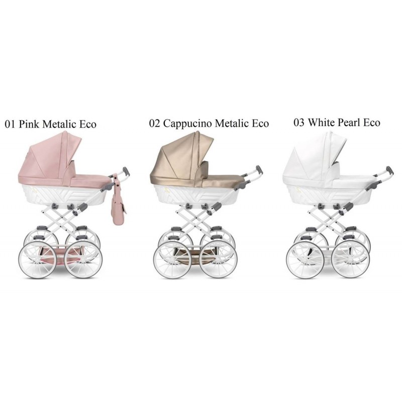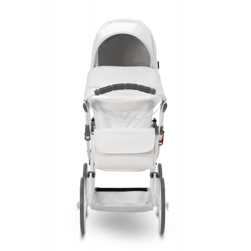 Biała eko-skóra White Pearl Eco jest miękka, trwała i łatwa w czyszczeniu — dzięki temu wózek wygląda pięknie na co dzień, niezależnie od pogody czy intensywności zabawy.