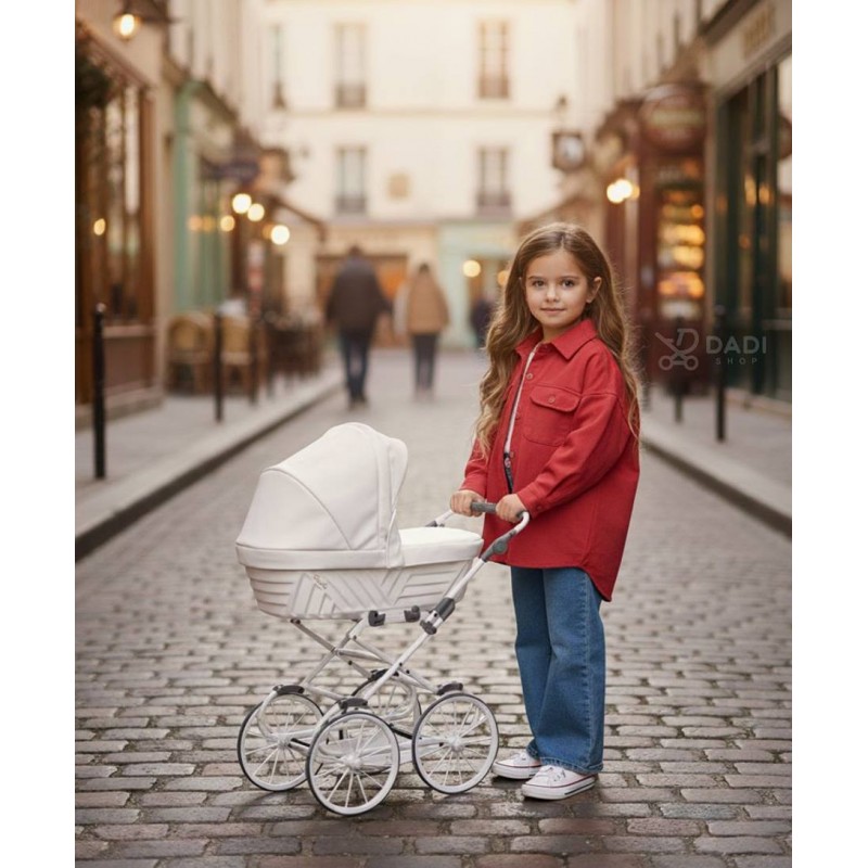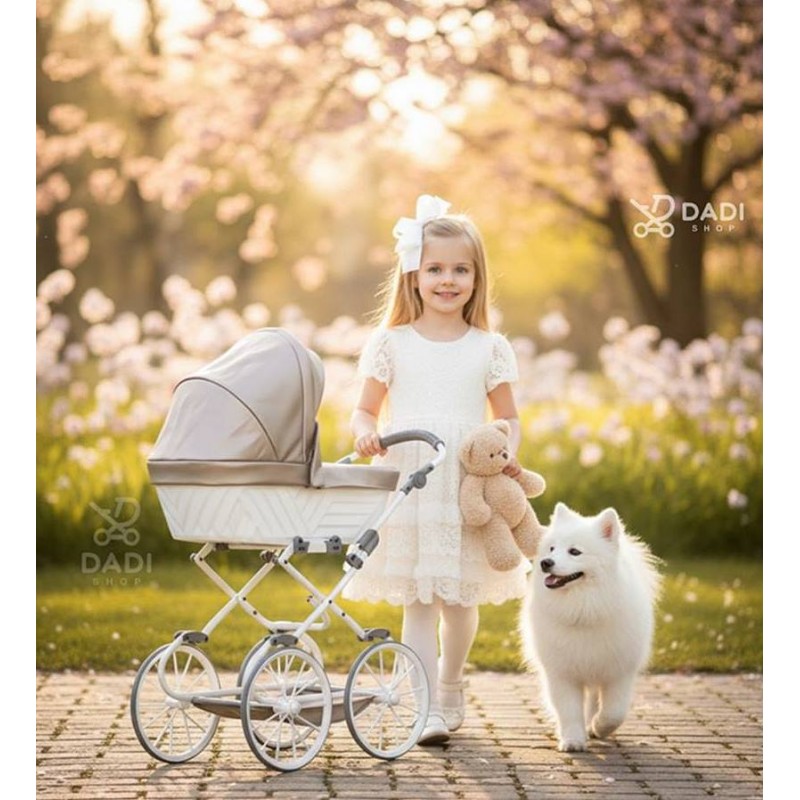 Duże retro koła ułatwiają prowadzenie, nawet po trawie czy chodnikach, a regulowana rączka pozwala dopasować wózek do wzrostu dziecka. To idealny wybór zarówno jako głęboki wózek dla lalek, jak i stylowy wózek lalkowy na spacery.