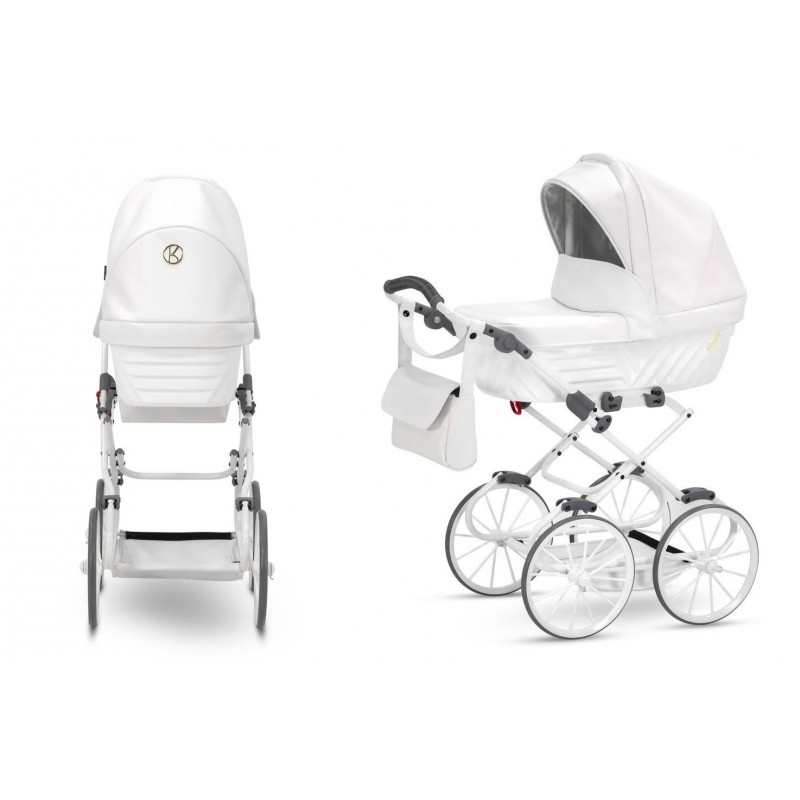 Mini wersja bestsellerowego wózka IVENTO, stworzona dla małych dziewczynek, które kochają elegancję i zabawę „jak mama”. Rossie 03 White Pearl Eco zachwyca perłową bielą, retro stylem i jakością marki KUNERT.