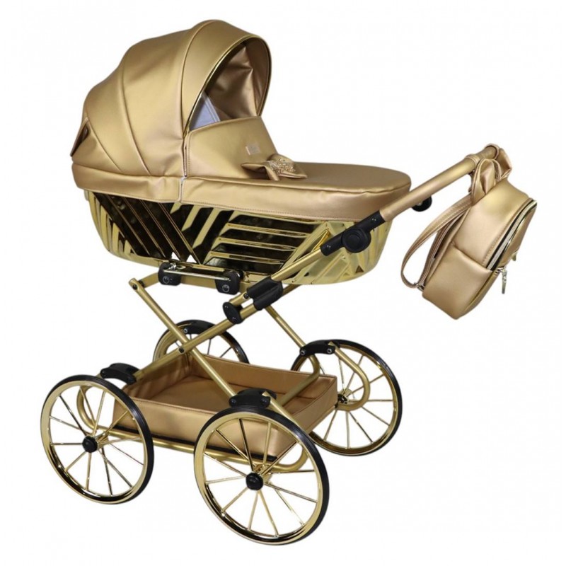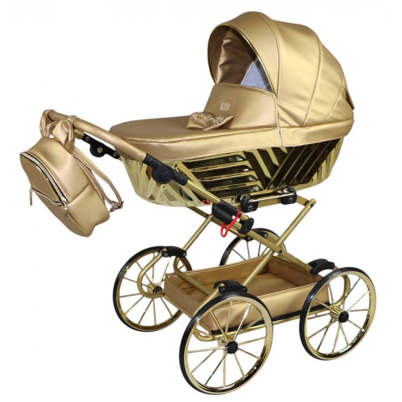 Złote wykończenia – szprychy w kołach, dolna część gondoli i rączka – nadają wózkowi królewski charakter. W komplecie znajduje się dopasowany plecaczek oraz kosz na drobiazgi, które ułatwiają zabawę i dodają elegancji każdej małej opiekunce. To prawdziwa miniaturowa perła, która robi wrażenie na każdym kroku.