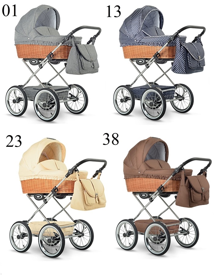 Klasyczny wózek dziecięcy Retro to połączenie ręcznie plecionej naturalnej wikliny z tkaninami w eleganckie, ponadczasowe wzory. Do produkcji wózków zastosowano najwyższej jakości materiały. Duże 14 calowe pompowane koła oraz tłumiące nierówności klasyczne wahacze sprawiają, że wózek sprawdza się na każdym terenie.