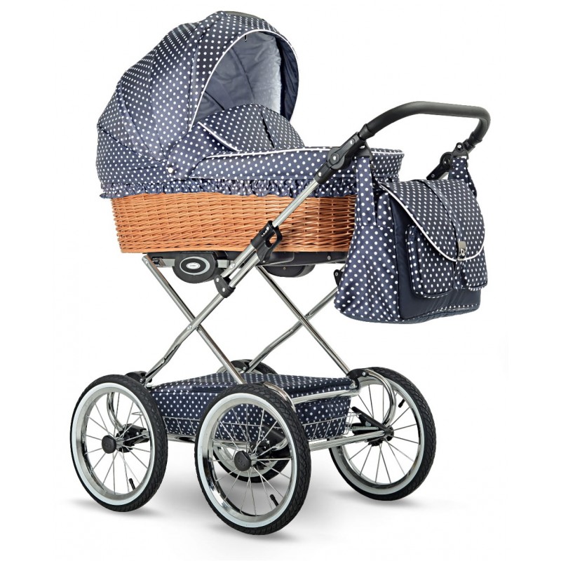 Klasyczny wózek dziecięcy Retro to połączenie ręcznie plecionej naturalnej wikliny z tkaninami w eleganckie, ponadczasowe wzory. Do produkcji wózków zastosowano najwyższej jakości materiały. Duże 14 calowe pompowane koła oraz tłumiące nierówności klasyczne wahacze sprawiają, że wózek sprawdza się na każdym terenie.