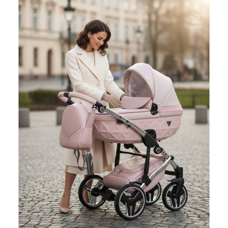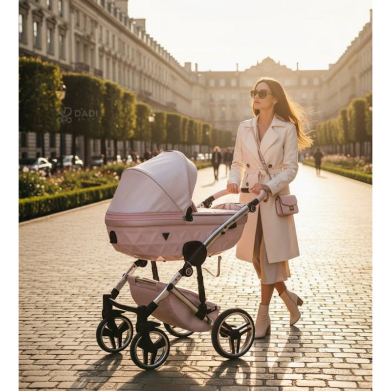 Wózek 2w1 Junama Dolce Pink 01 to kwintesencja delikatności i stylu. Idealny dla rodziców, którzy pragną połączyć luksusowy design z codziennym komfortem swojego dziecka.