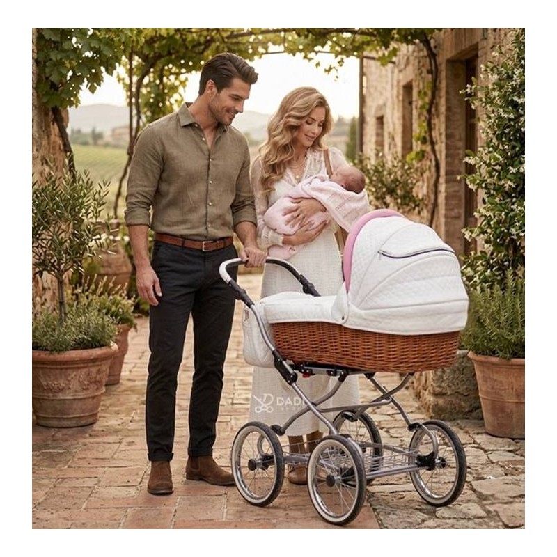 Styl retro, naturalna wiklina i subtelny wzór sprawiają, że każdy spacer staje się małym rytuałem spokoju i bliskości.