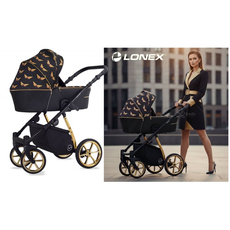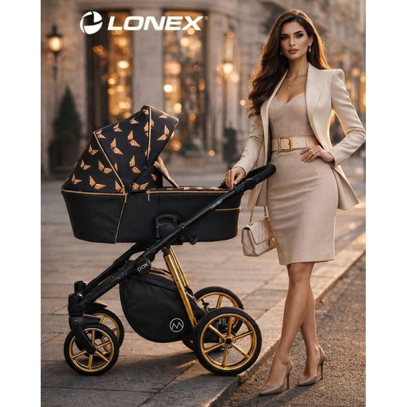 ✅ Lonex Pax Wings 3w1 to wyjątkowy wózek dziecięcy, który łączy luksus z funkcjonalnością. Jego czarny kolor z pozłacanymi elementami nadaje mu elegancji, podkreślając jego wyjątkowy charakter. Stelaż w złotym kolorze wykonany z aluminium zapewnia wytrzymałość, jednocześnie pozwalając na łatwe składanie do kompaktowych rozmiarów. Dzięki automatycznej blokadzie unikniemy przypadkowego złożenia się wózka. Żelowe, bezobsługowe koła oraz regulowana amortyzacja z nowoczesnym systemem Anti-Shock zapewniają gładką jazdę na różnych powierzchniach.