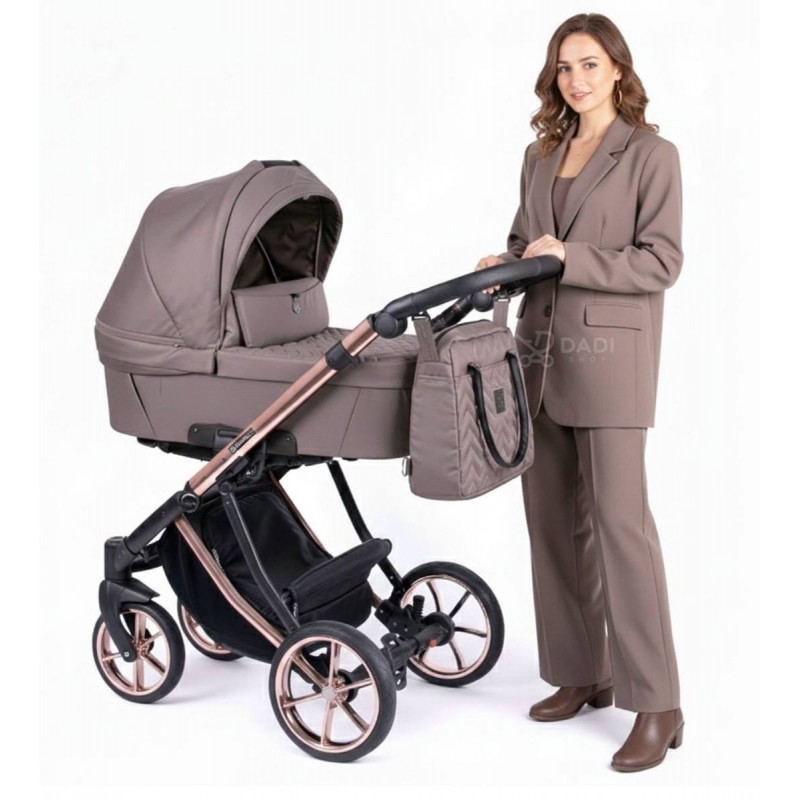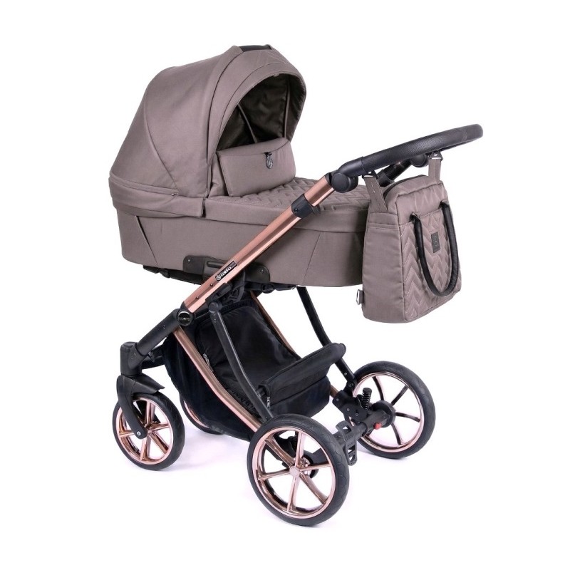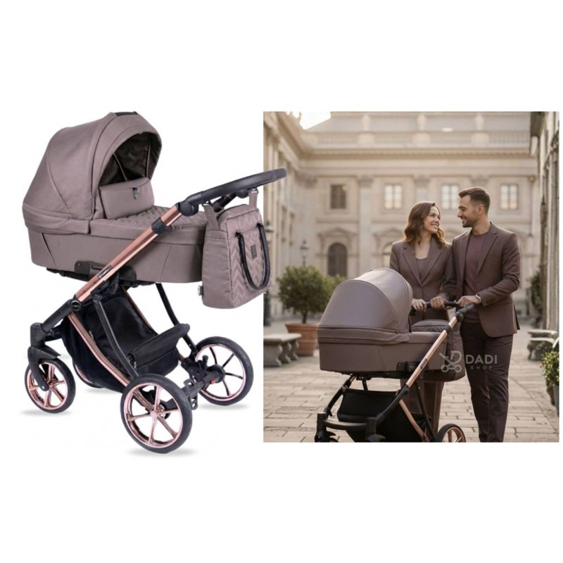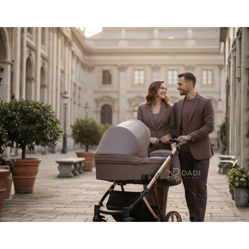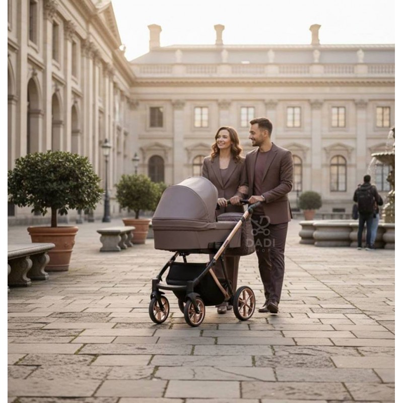 Subtelna rama rose gold i jasna kolorystyka taupe podkreślają premium charakter wózka Dante – idealnego zestawu podróżnego dla nowoczesnych rodziców.
