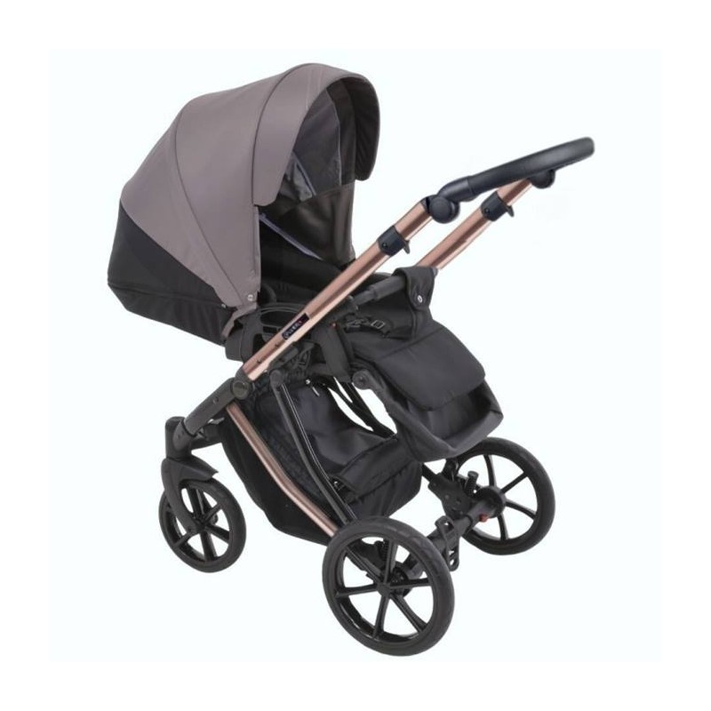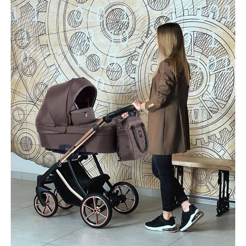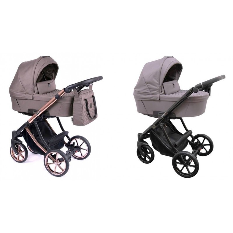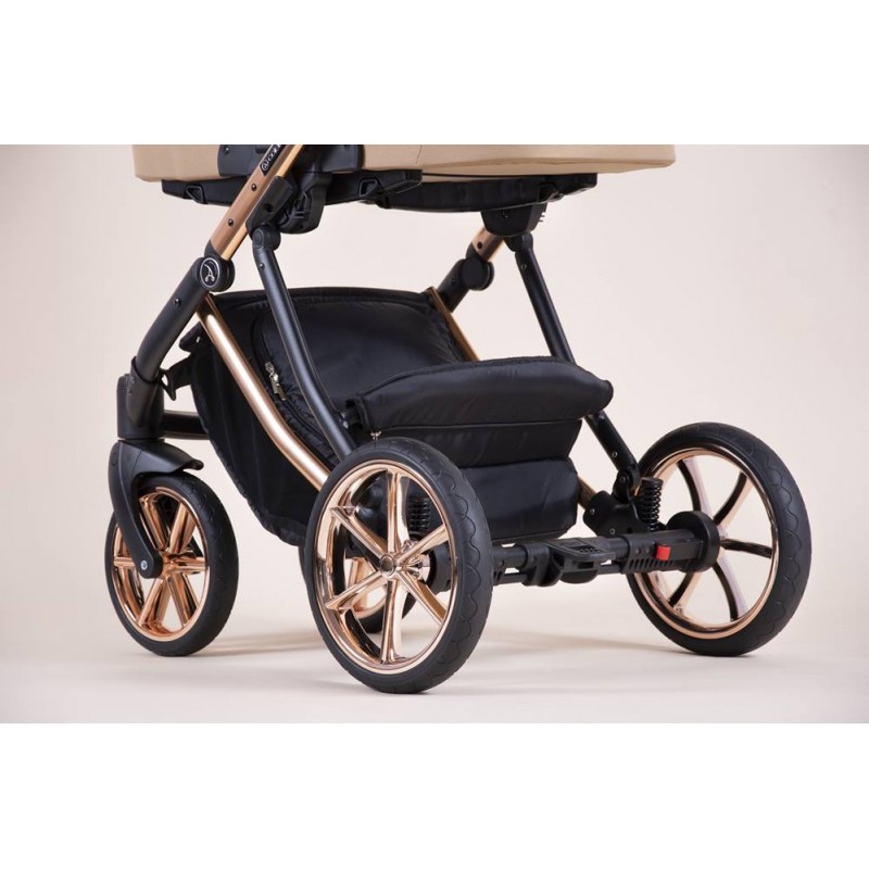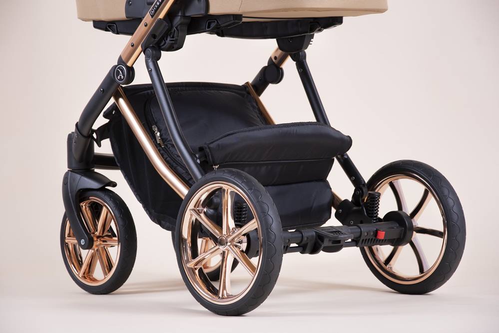Subtelna rama rose gold i jasna kolorystyka taupe podkreślają premium charakter wózka Dante – idealnego zestawu podróżnego dla nowoczesnych rodziców.