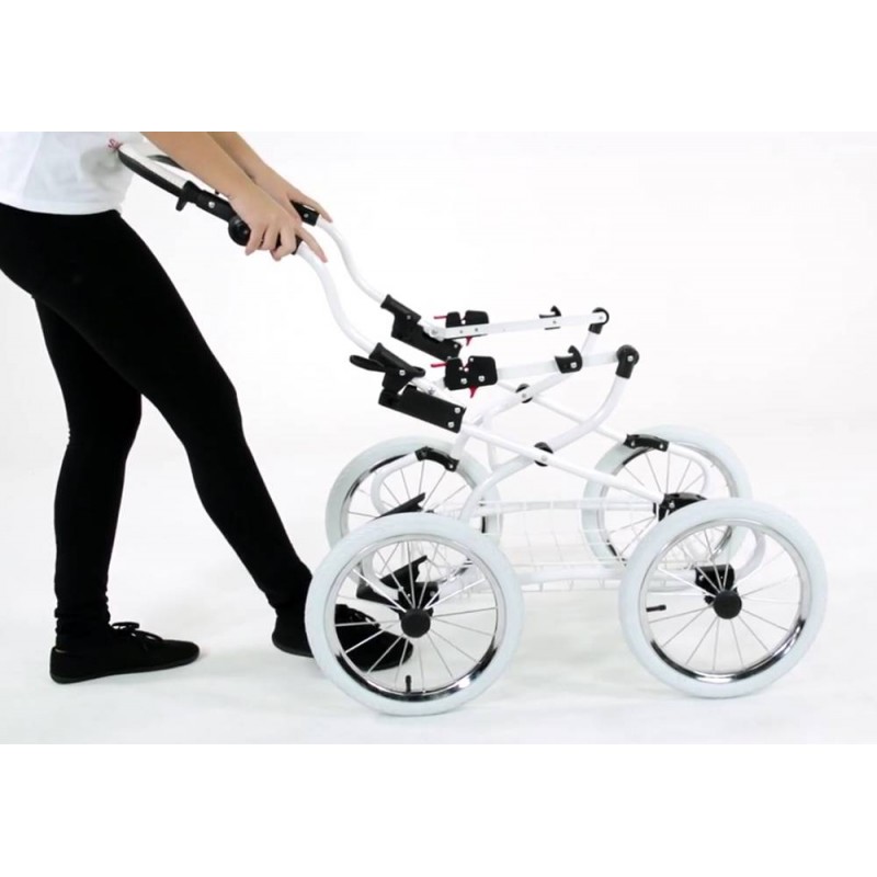 To wózek 3w1 z prawdziwymi, dużymi pompowanymi kołami (14 cali!), które od razu przywołują klimat klasycznych retro spacerówek – stabilne, amortyzowane, gotowe na miasto, bruk i lekkie bezdroża. Wysokie, masywne koła + miękkie zawieszenie na wahaczach = spacer jak z innej epoki, ale z komfortem XXI wieku.