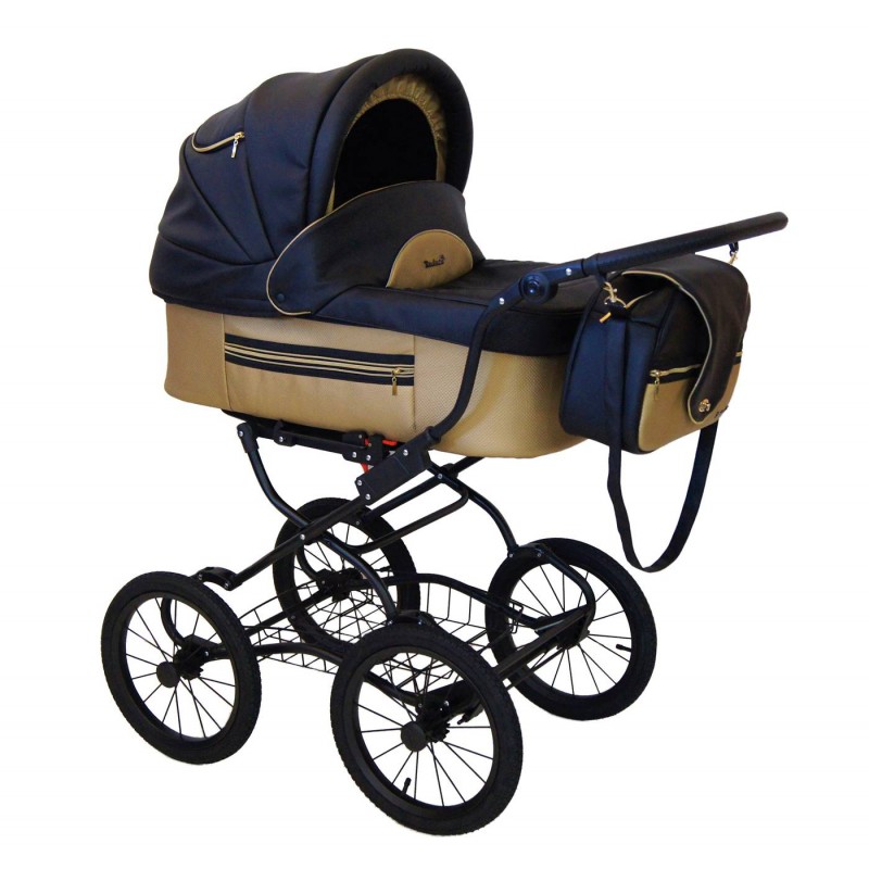 Głęboka gondola na solidnym stelażu z potężnymi kołami – stabilność, komfort i ten niepowtarzalny retro look w granacie ze złotem, który sprawia, że spacer to czysta przyjemność dla Ciebie i maluszka.