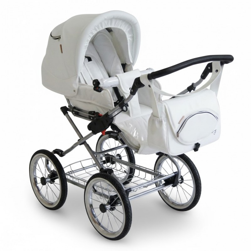 Ponadczasowy design retro: Klasyczne linie, harmonijna sylwetka i śnieżnobiała eko-skóra sprawiają, że wózek prezentuje się prestiżowo i wyróżnia się w każdym otoczeniu.