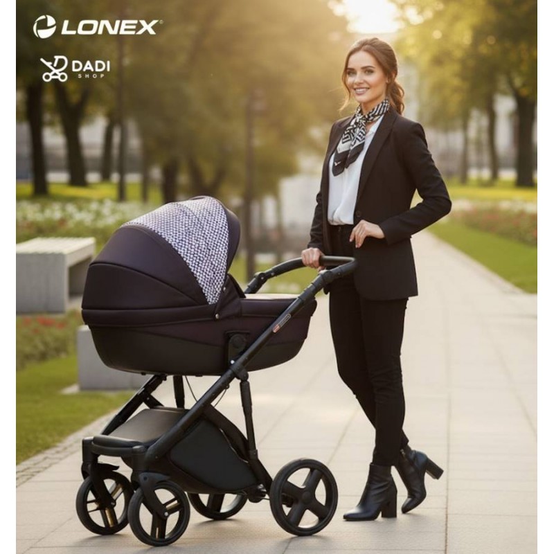 Sesja plenerowa prezentująca wózek wielofunkcyjny Lonex Comfort Galaxy – połączenie stylu i klasy, dostępny w ofercie Dadi-Shop.
