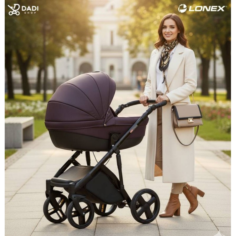 Stylowy wózek dziecięcy Lonex Comfort Galaxy w eleganckim odcieniu fioletu – idealny towarzysz spacerów w plenerze, dostępny w ofercie Dadi-Shop.