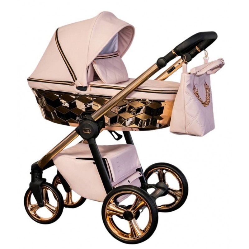 Pudrowy róż i złote detale sprawiają, że każdy spacer z dzieckiem staje się elegancki, komfortowy i pełen stylu.