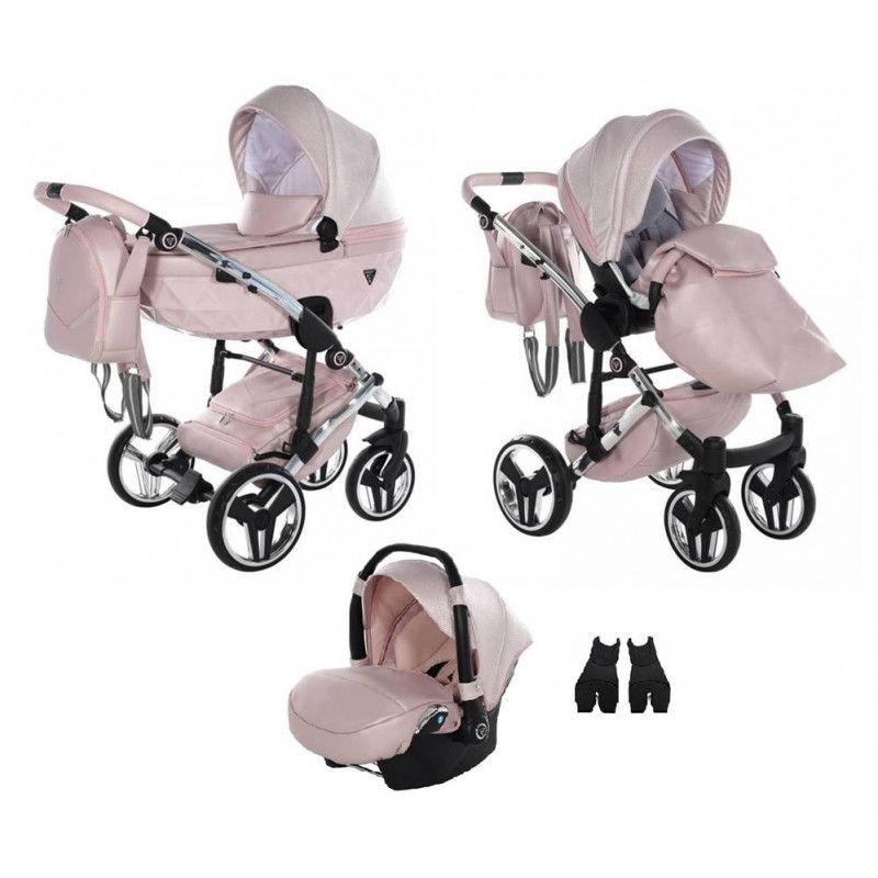 Zestaw wózka dziecięcego Junama Dolce 01 – gondola, spacerówka i fotelik w delikatnym pudrowym różu.