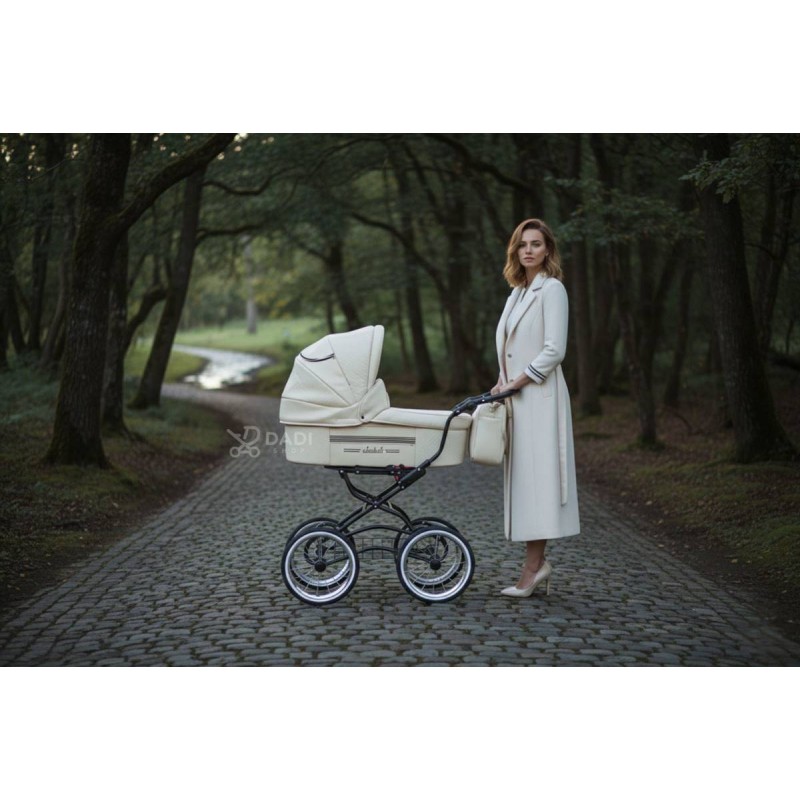 Beżowy ISABELL wyróżnia się subtelną elegancją i spokojną kolorystyką. Jasna tapicerka z eko-skóry w połączeniu z klasyczną linią sprawia, że wózek wygląda lekko i szlachetnie, niezależnie od otoczenia – w mieście, parku czy na leśnej ścieżce.