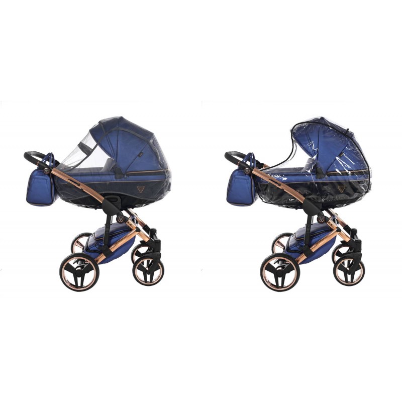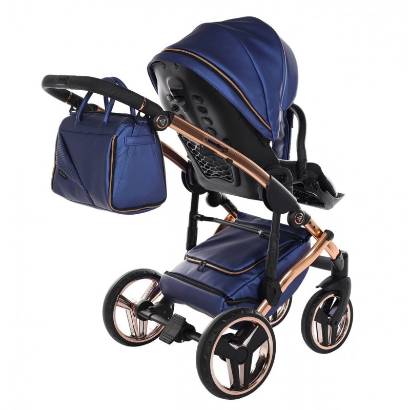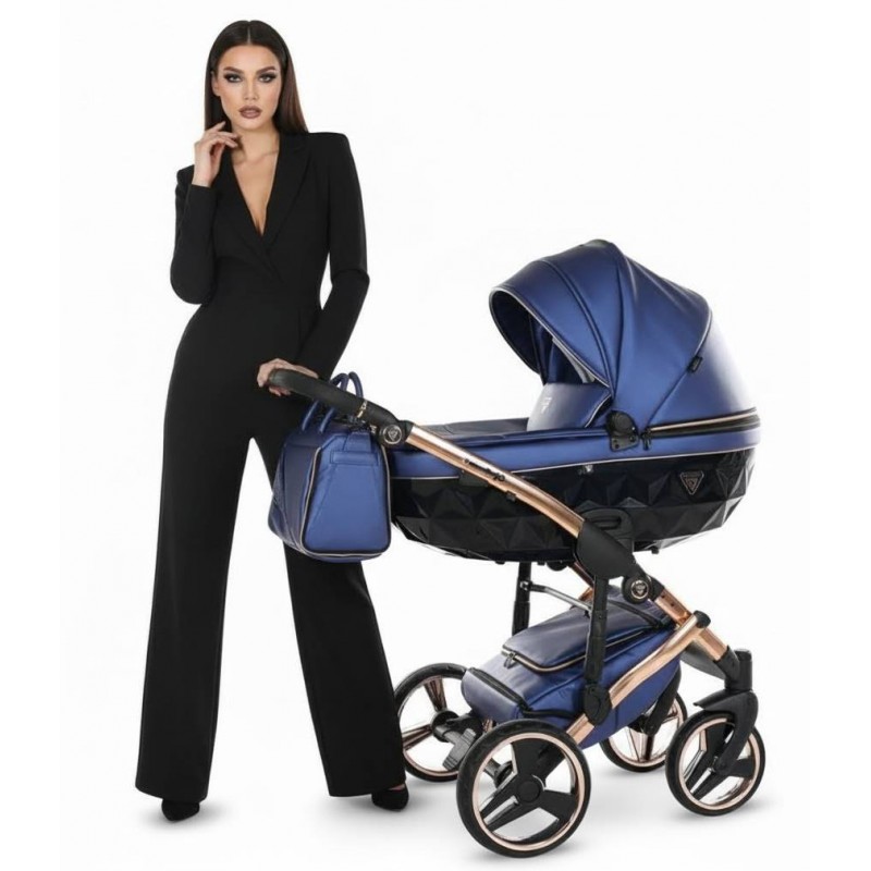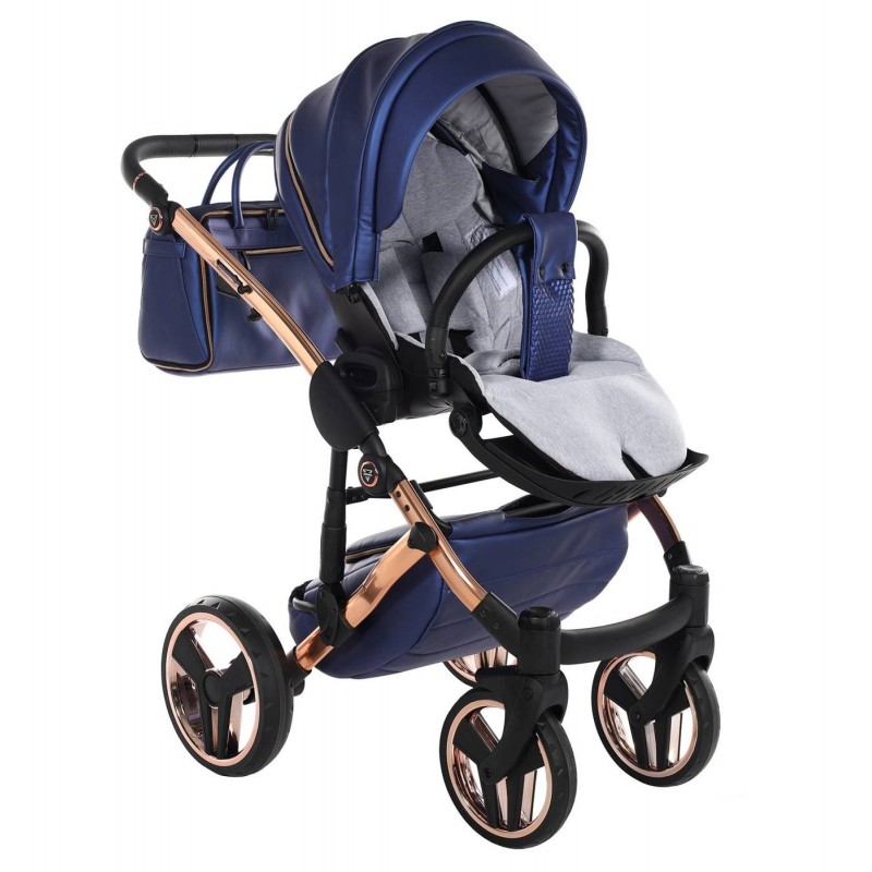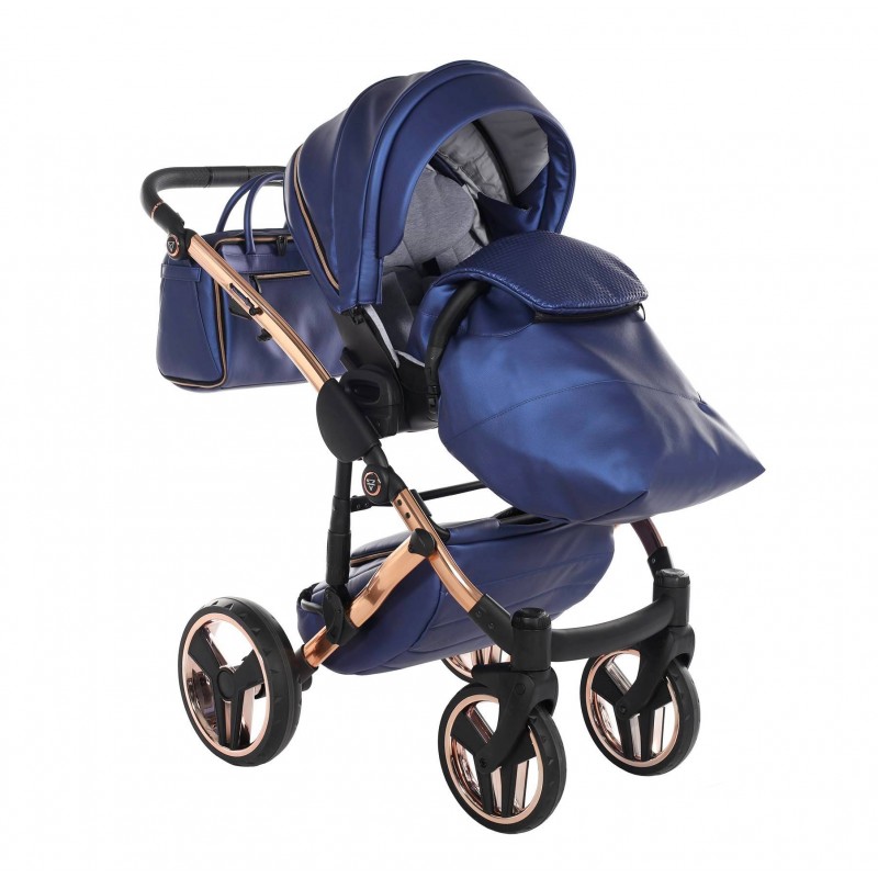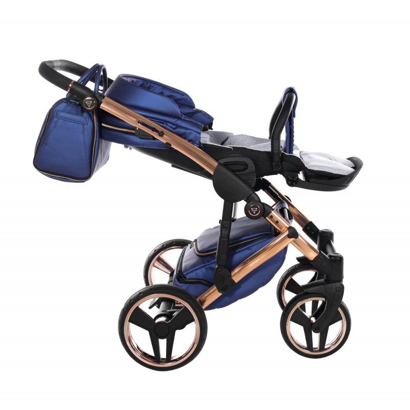 Nowoczesny wózek dziecięcy Junama Diamond Fluo 01 w odcieniu blue – styl i wygoda na złotym stelażu.